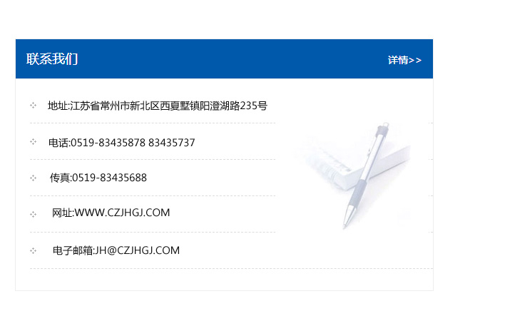 地址:常州市新北區友邦商務大廈1幢16、17層  電話:0519-85101652  傳真:0519-85112595  郵編:213022  網址:www_cz-jiayue_cn.stjmjx.com  郵箱:xiajifengaa@163.com
